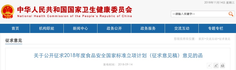 關(guān)于公開征求2018年度食品安全國家標(biāo)準(zhǔn)立項(xiàng)計(jì)劃(征求意見稿)意見的函