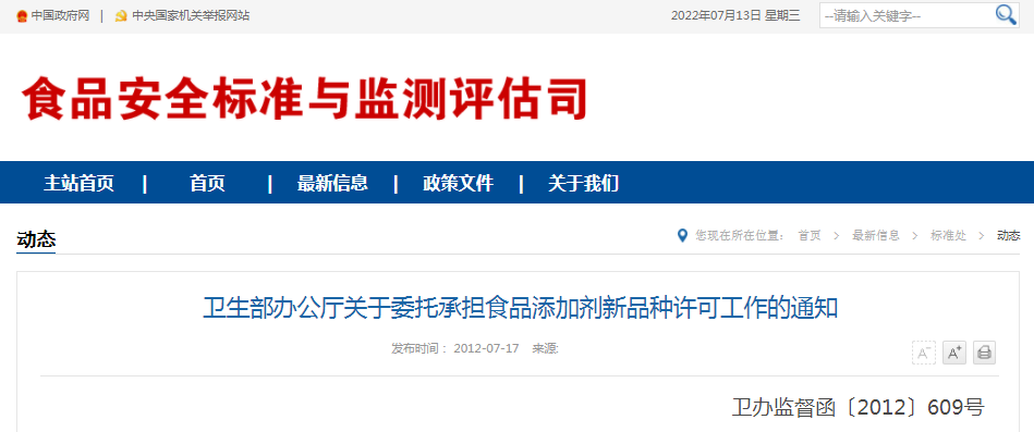 為做好食品添加劑新品種安全性審查和許可工作,根據(jù)《食品安全法》及其實施條例、中央編辦《關(guān)于印發(fā)〈國家食品安全風(fēng)險評估中心組建方案〉的通知》(中央編辦發(fā)〔2011〕21號)規(guī)定,現(xiàn)決定委托你們承擔(dān)食品添加劑新品種許可的技術(shù)審查等工作。具體事宜通知如下: