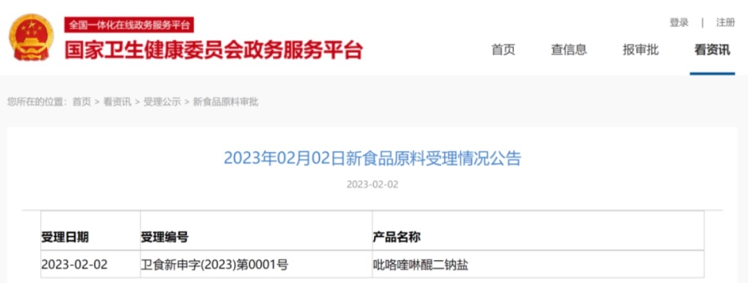 2023年2月2日,國(guó)家衛(wèi)健委發(fā)布吡咯喹啉醌二鈉鹽(PQQ)受理公告,受理編號(hào):衛(wèi)食新申字(2023)第0001號(hào),這是2023年第一個(gè)被受理的新食品原料,此前,PQQ在2022年3月于國(guó)家衛(wèi)健委2022年第1號(hào)公告中已經(jīng)被批準(zhǔn)為新食品原料,其生產(chǎn)工藝是化學(xué)合成法,可應(yīng)用于飲料領(lǐng)域。